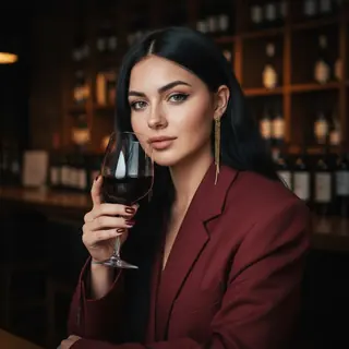 Фотореалистичный кадр в вечернем ресторане/винном баре. Девушка с очень длинными объёмными слегка волнистыми волосами держит бокал красного вина у ли…