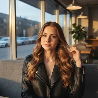 В кафеФотореалистичный портрет молодой женщины с пронзительными глазами и длинными, блестящими волосами. Она сидит в современном кафе с панорамными окнами…