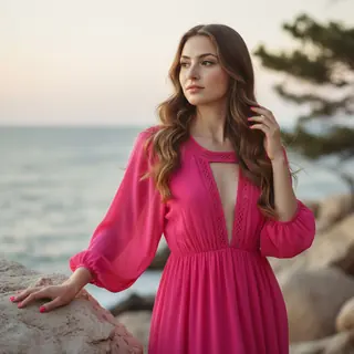 Создай фотореалистичное изображение, полностью сохраняя внешность женщины. Стройная девушка с длинными волосами, слегка развевающимися на ветру. Пове…