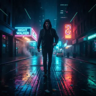 Ночной стрит с неоном: если приложено фото возьми меня с фото, если нет то человека, который идёт по городу в сторону камеры, его лицо отчетливо видн…