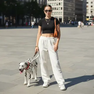 Женщина в полный рост, стильный городской летний образ: на ней черный облегающий кроп-топ и свободные молочные спортивные брюки oversize на широкой р…