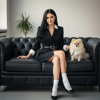 Фотореалистичный fashion-кадр: женщина в чёрном удлинённом пиджаке-платье с белыми манжетами и воротником, узким поясом с золотой пряжкой, белые носк…