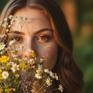 Вертикальный крупный портрет на природе при тёплом закатном свете. Камера очень близко к лицу, акцент на глазах и верхней части лица. Лицо слегка пов…